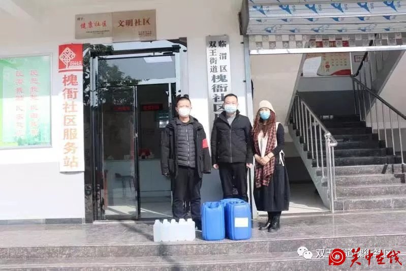 2020年2月3日槐衙社区二组爱心人士李雄涛捐赠防疫物资(84消毒液一箱)。槐衙社区一组爱心人士李红星捐赠防疫物资(消毒液2大桶、4小桶).