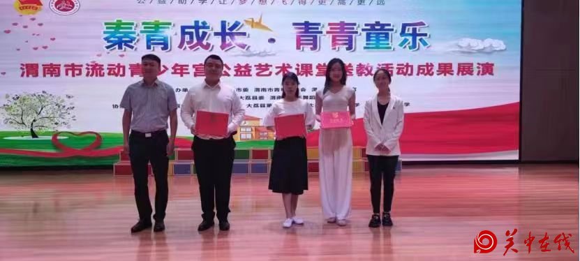 展演中,渭南市青联秘书长、市青少年宫主任张力,团县委副书记陈丹为“秦青成长 青青童乐”艺术课堂送教活动中做出突出贡献的公益教师马海萍、李悦莹、李庆颁发“公益突出贡献”荣誉证书。